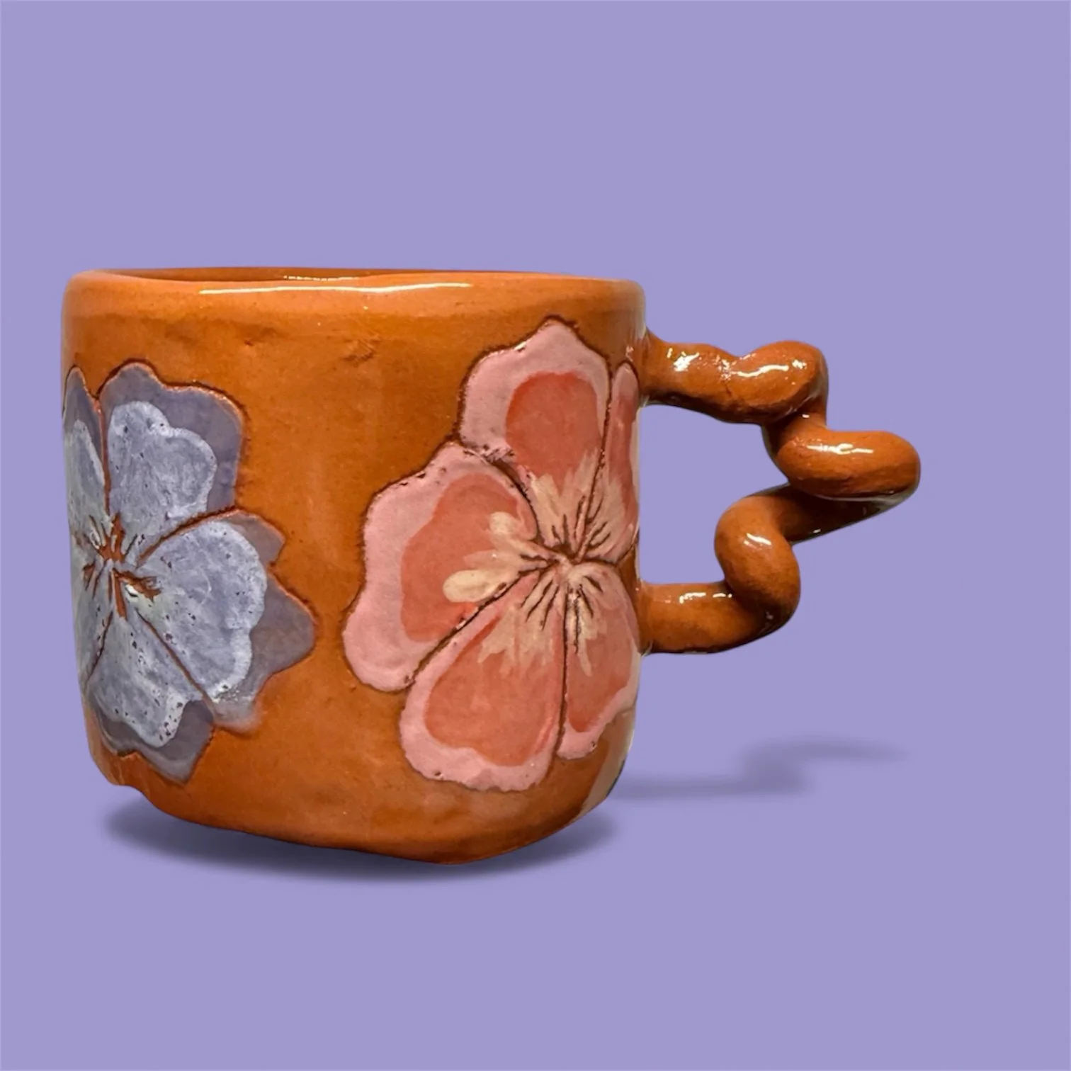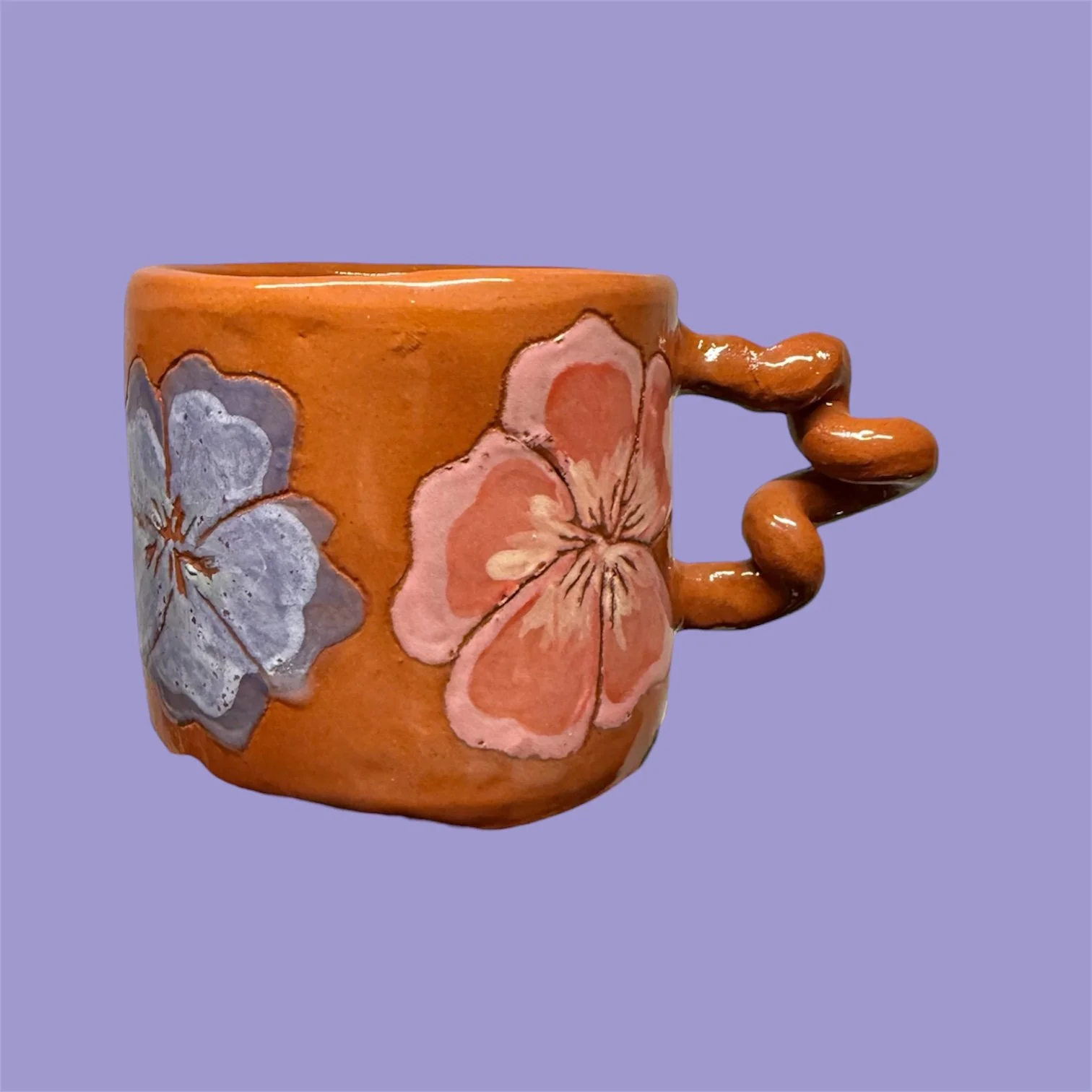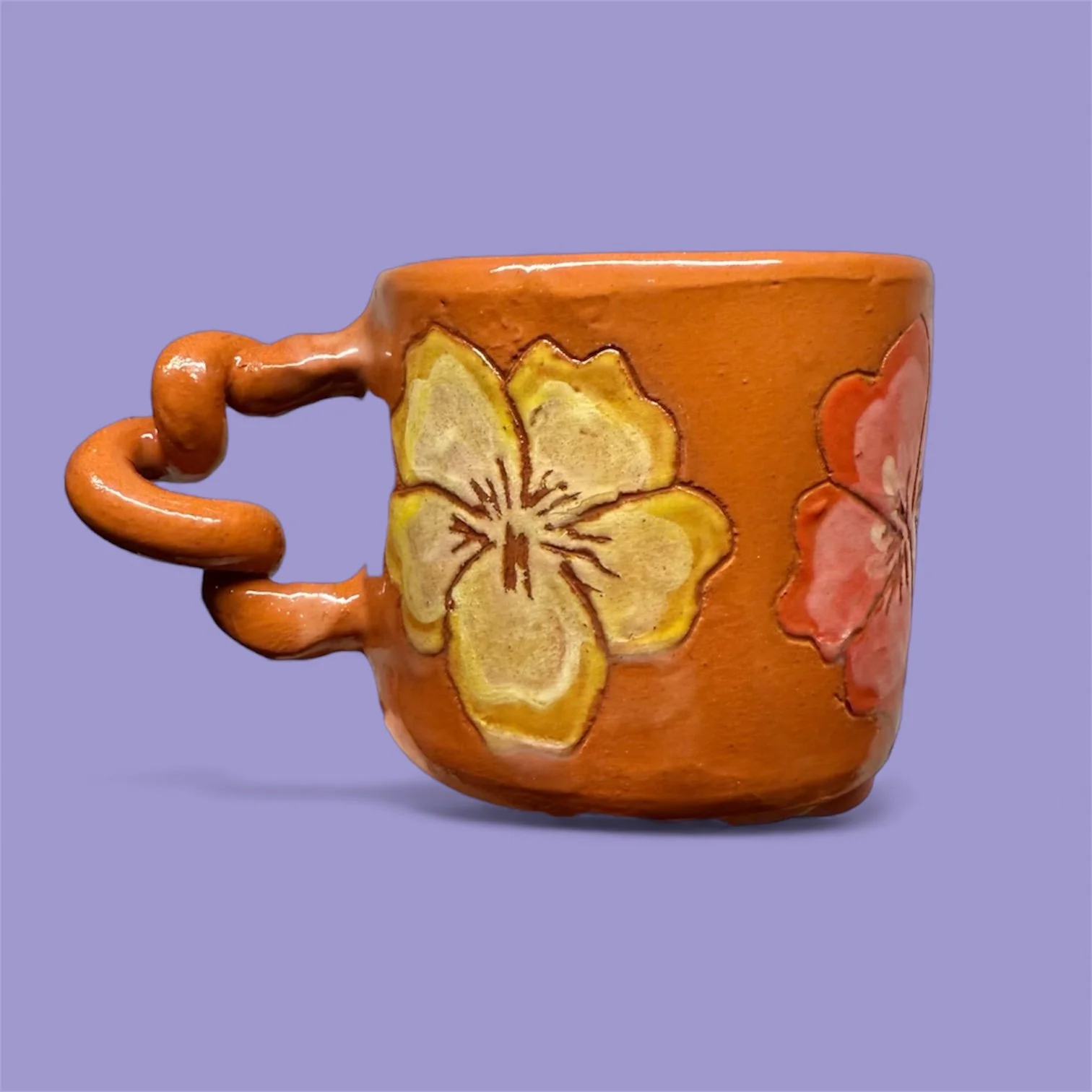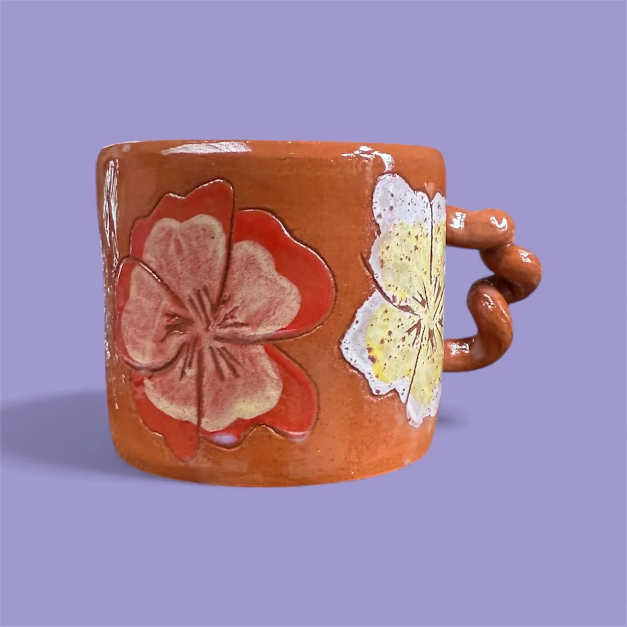 Hand built terracotta wiggle mug with hand carved flower design and painted with underglaze.